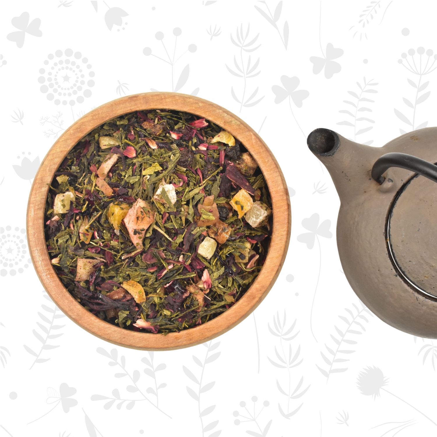 Συστατικά: Ιβίσκος, πράσινο τσάι, μήλο, βατόμουρο, πορτοκαλί, ανανά, σταφίδα,άρωμα