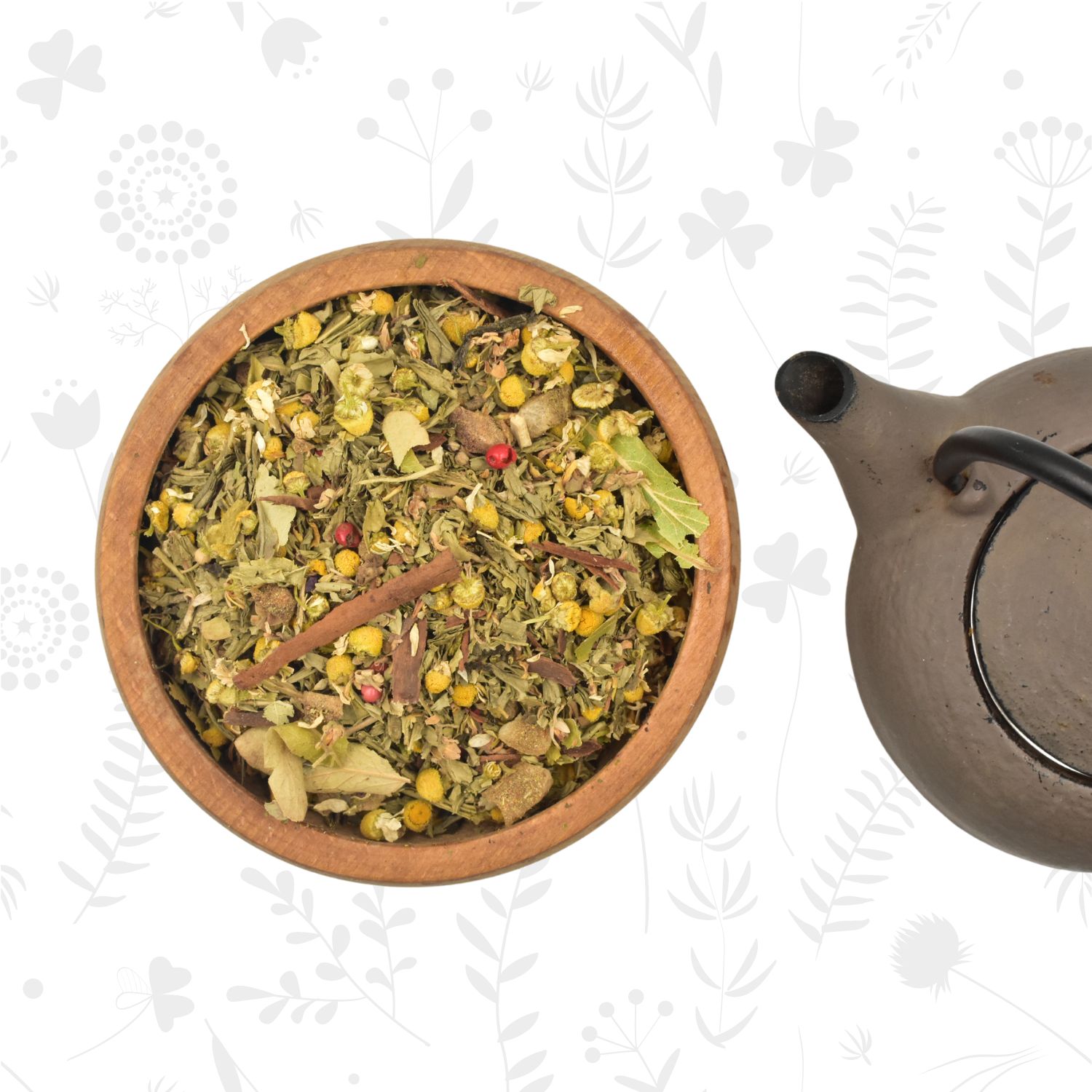 Συστατικά: Πράσινο τσάι ντεκαφεϊνέ, βότανα τούλσι, τίλιο, χαμομήλι, πιπερόριζα, ανανάς, πιπέρι, κανέλα κεϋλάνης, άνθη Κενταύριου Λουκιανού, άρωμα